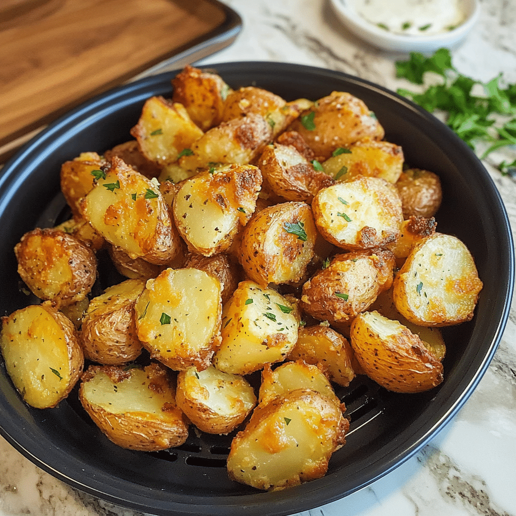 - Garnish and Serve: Once the potatoes are done, remove them from the air fryer and transfer them to a serving dish. Garnish with fresh parsley and grated parmesan cheese if desired. Serve immediately while hot and crispy.