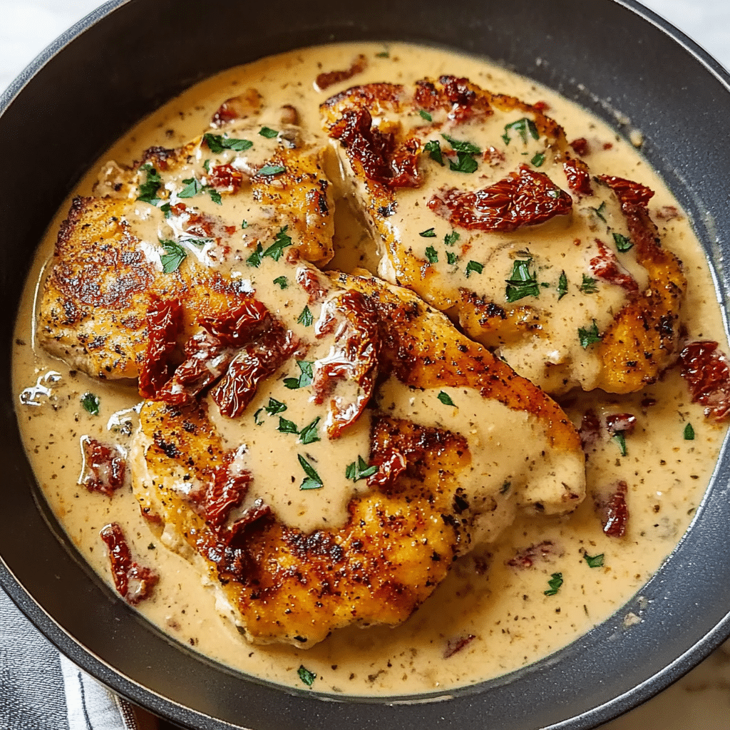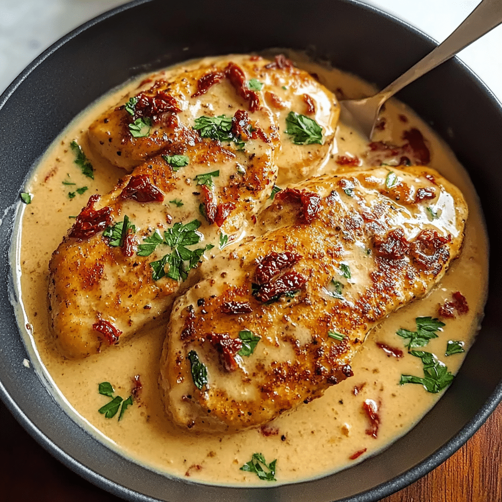 - Rich and Creamy Sauce: The sun-dried tomato cream sauce is velvety and rich, with bursts of savory flavors from the tomatoes and garlic that complement the chicken perfectly.