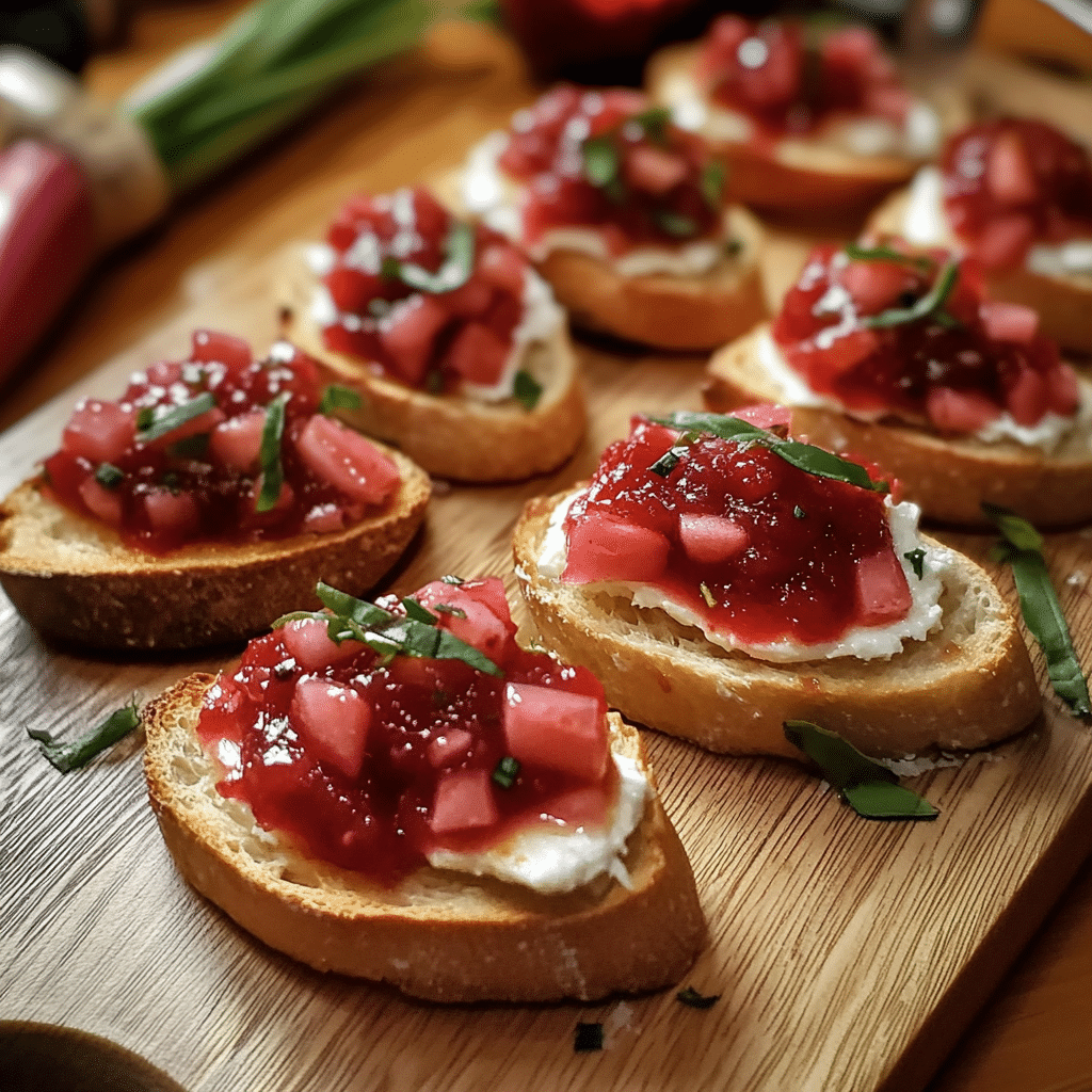 Goat Cheese Crostini with Rhubarb Chutney is a simple yet sophisticated appetizer that combines the tangy creaminess of goat cheese with the bright, sweet, and tart flavor of rhubarb chutney. Whether you’re hosting a special occasion or preparing a casual snack, this dish is a versatile, delicious choice that’s guaranteed to delight your guests. The balance of flavors, textures, and colors makes it an elegant addition to any spread, and the dish is easy to customize to suit your tastes. Enjoy the beauty of fresh ingredients and the artistry of combining them in this stunning and satisfying appetizer!