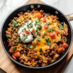 Ground Beef Burrito Skillet is a delicious, customizable, and easy-to-make meal that’s perfect for a quick weeknight dinner or meal prep for the week. Packed with flavorful ingredients like seasoned ground beef, beans, corn, and rice, it delivers all the comforting burrito flavors without the fuss of rolling them up. Whether you serve it with traditional burrito toppings or over tortillas, this skillet meal is sure to please the whole family. It’s quick, filling, and full of flavor, making it a perfect dish for busy nights or casual meals with friends and family. Enjoy!