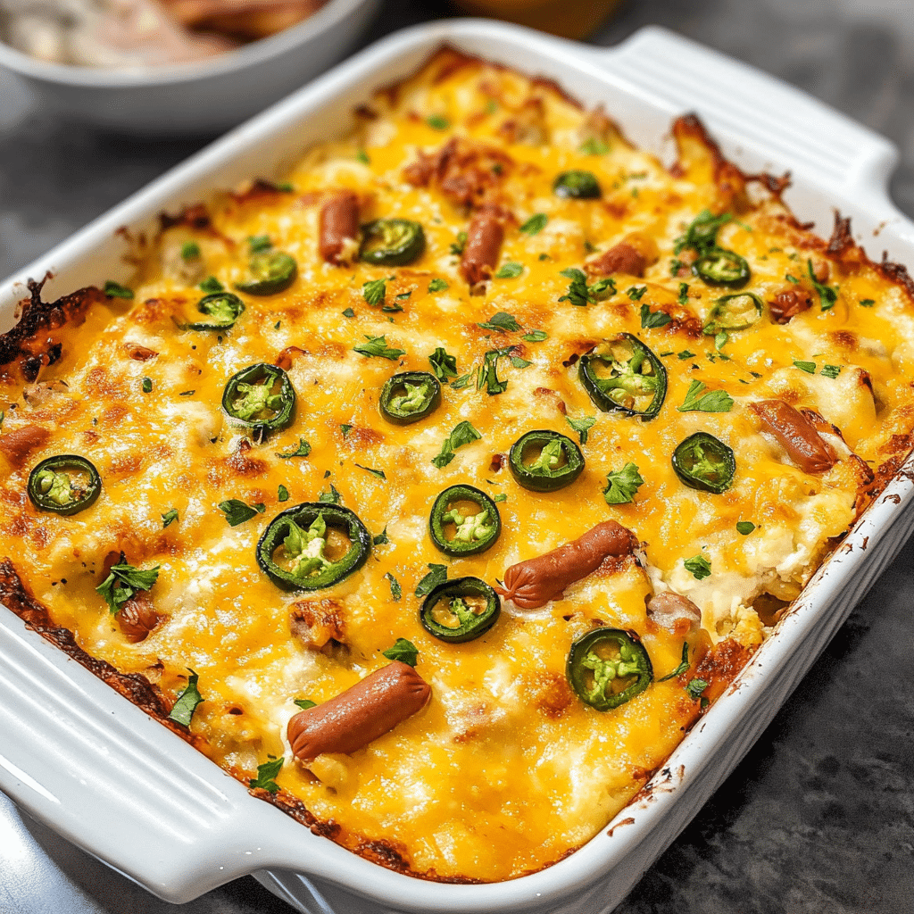 - Spicy Kick: Fresh jalapenos give this casserole the heat you love from jalapeno poppers, while the hotdogs add savory, hearty flavor and a satisfying bite.