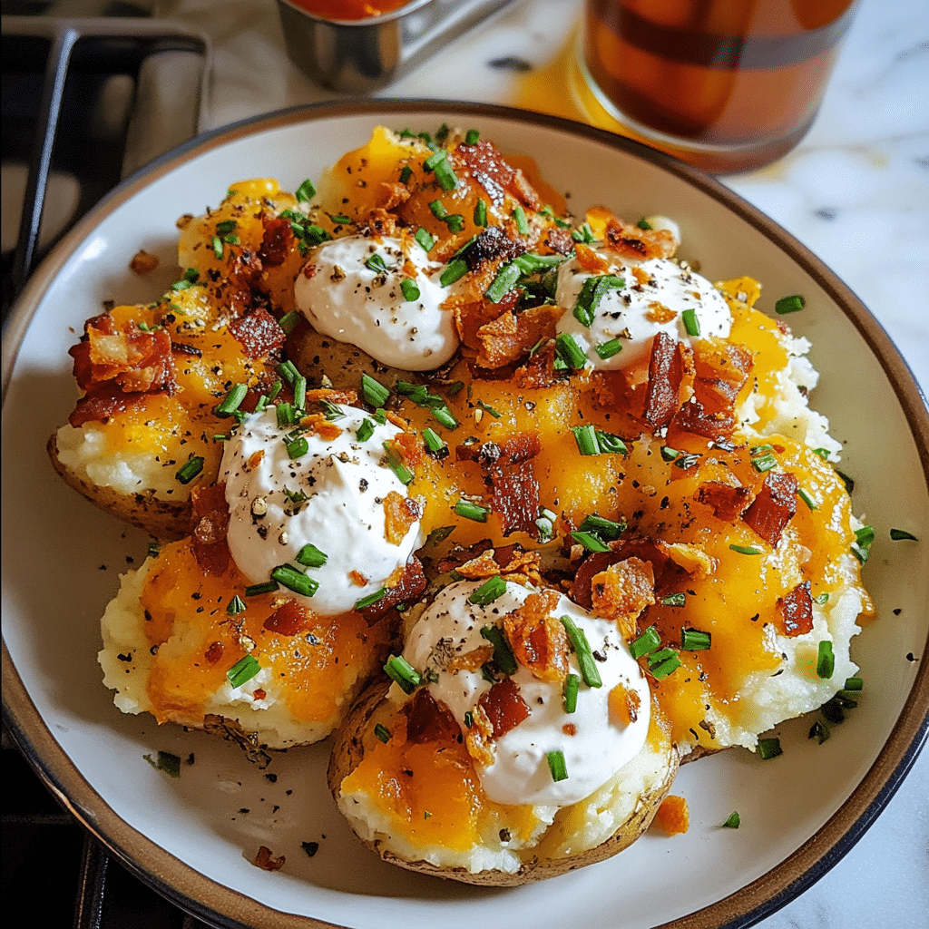 - Loaded with Flavor: Topped with melted cheese, crispy bacon, sour cream, and green onions, these potatoes are packed with savory, rich flavors that elevate the humble spud.